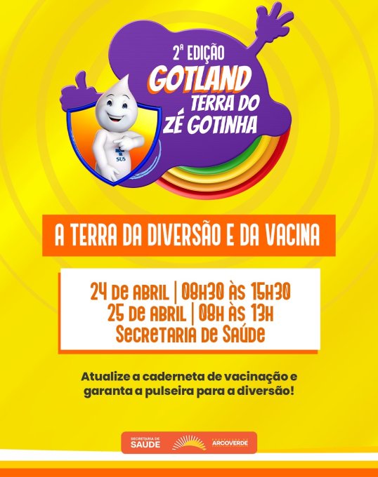 A Prefeitura de Arcoverde, por meio da Secretaria de Saúde, realiza, nos dias 24 e 25 de abril de 2026, a segunda edição da campanha “Gotland - A Terra do Zé Gotinha”. A ação acontece na sede da Secretaria de Saúde e é voltada para crianças de 6 meses a 10 anos, com foco na atualização da caderneta de vacinação e na ampliação da cobertura vacinal no município.
