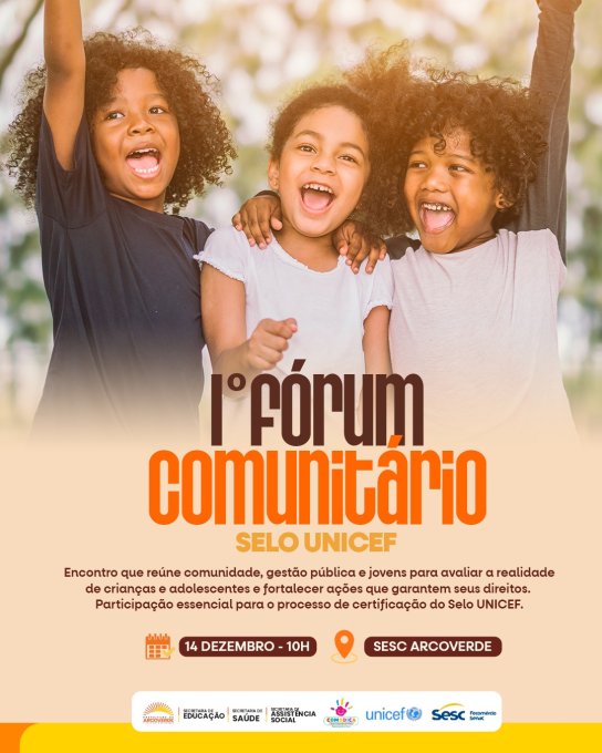 A Prefeitura de Arcoverde, por meio da Secretaria de Assistência Social e do Conselho Municipal dos Direitos da Criança e do Adolescente (CMDCA), promove no próximo dia 14 de dezembro, às 10h, no Sesc Arcoverde, o 1º Fórum Comunitário do Selo UNICEF - Edição 2025/2028. O encontro tem como objetivo ampliar a escuta, o diálogo e o protagonismo de crianças e adolescentes na construção de políticas públicas voltadas à garantia de direitos.