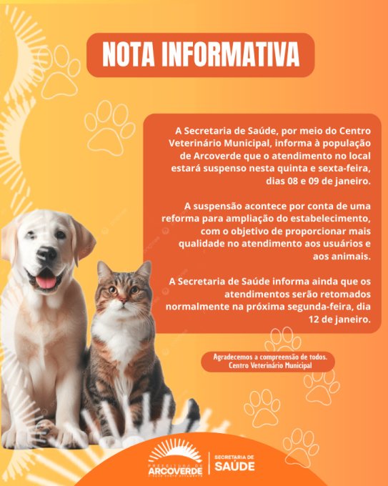 A Prefeitura de Arcoverde, por meio da Secretaria de Saúde, informa que o Centro Veterinário Municipal terá os atendimentos temporariamente suspensos nesta quinta e sexta-feira, dias 8 e 9 de janeiro. A medida é necessária para a realização de obras de reforma e ampliação da unidade.