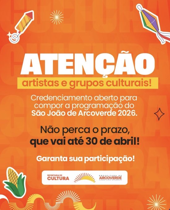 A Prefeitura de Arcoverde, por meio da Secretaria de Cultura, informa que artistas e grupos interessados em integrar a programação do São João 2026 devem realizar credenciamento até o dia 30 de abril.